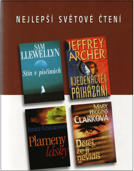 Svazek obsahuje zkrácené verze čtyř úspěšných románů od amerických a anglických autorů. Doplněno krátkými medailonky uvedených autorů. Kniha obsahuje tyto tituly: Llewellyn, Sam: Stín v písčinách Archer, Jeffery: Jedenácté přikázání Graham, Janice: Plameny lásky Clark-Higgins, Mary: Dělej, že ji nevidíš 1. Stín v písčinách: Píše se rok 1903. Závodní jachtař Charlie Webb se prý při honbě za vítězstvím neohlíží na nic a na nikoho. Pak ovšem vyrazí polorozpadlou jachtou na záchrannou operaci na Friské ostrovy a náhle jde o víc než o vítězství... 2. Jedenácté přikázání: Osmadacet let žil Connor Fitzgerald dvojím životem. Navenek pracoval jako zaměstnanec pojišťovny, ve skutečnosti byl nejaktivnějším likvidátorem nepohodlných osob. Pár dní před odchodem do penze se Fitzgerald střetává s nečekaným nepřítelem - svoji šéfkou... 3. Plameny lásky: Advokát Ethan Brown se má co nevidět oženit s Katii Anne Mackey, dcerou nejbohatšího rančera v západním Kansasu. Když však na matčin pohřeb přijede z Paříže elegantní Annette Zeldin a pověří Ethana vyřizováním matčiny pozůstalosti, roznítí v Ethanovi milostnou vášeň a donutí ho zradit svou lásku... 4. Dělej, že ji nevidíš: Mladá a pohledná agentka realitní kanceláře Lacey Farrell prodává byt snů, luxusní mezonet na Manhattanu s výhledem na Central Park. Jednoho večera se tam však objeví v nesprávnou dobu a pak už ji nezbývá než utíkat...