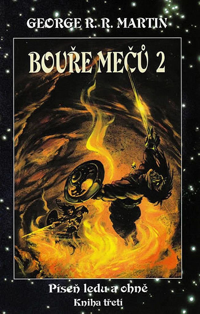 3. kniha série Píseň ledu a ohně – část 2. Z pěti uchazečů o trůn je jeden mrtvý, další upadli v nemilost, a boj, v němž jsou bez skrupulí uzavírána nová spojenectví a rušena stará, zuří nemilosrdně dál. Moc rodu Lannisterů hrozivě sílí, avšak Tyrion trpí stále většími ústrky od své intrikánské sestry, krutého otce i zkaženého sadistického synovce. Robb Stark je nucen bránit mladé království proti zuřivosti Greyjoyů, kteří si chtějí Sever zabrat pro sebe. Divocí vytáhli zpoza Zdi a spolu s nimi nabývají na síle Jiní. O celý kontinent dál se vydává na válečné tažení Daenerys a její draci nebezpečně rostou.Každý podniká odhodlanou výpravu za své vítězství, a všichni dohromady halí svět do temné bouře mečů, která je však pouhou dětskou šarvátkou ve srovnání s válkou mezi silami dobra a zla, jejíž hrozba se blíží… První vydání. (zdroj: legie.info)