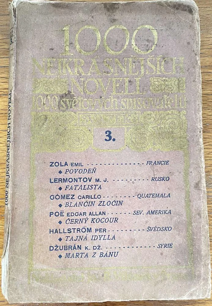 Třetí svazek edice 1000 nejkrásnějších novel od 1000 světových spisovatelů přináší výběr z tvorby Émila Zoly, Michaila Lermontova, Enriqua Gómeze Carrilla, Edgara Allana Poea, Pera Hallströma a Chalíla Džibrána. Kniha je sestavena a opatřena literárními úvody Františkem Sekaninou. Zahrnuje povídky Povodeň (Francie), Fatalista (Rusko), Blančin zločin (Guatemala), Černý kocour (USA), Tajná idyla (Švédsko) a Marta z Bánu (Libanon).