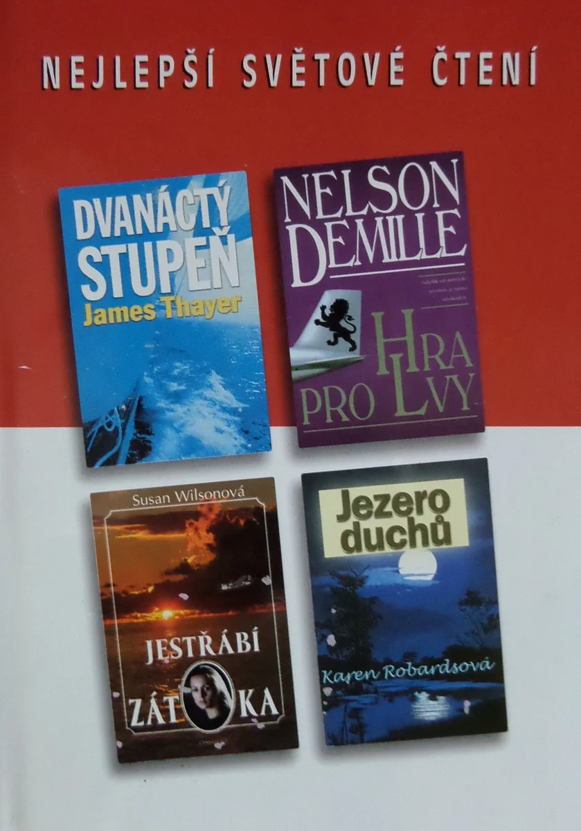 Zkrácené verze nejlepších románů současných světových autorů v jedné antologii. Svazek obsahuje čtyři romány a je vyváženou kombinací akčního příběhu plného napětí, příběhu s detektivní zápletkou, příběhu ze života a v neposlední řadě také příběhu, v nichž hraje hlavníroli láska a mezilidské vztahy. 1. Dvanáctý stupeň-James Thayer: Beringovo moře v zimě představuje zatěžkávací zkoušku i pro ty nejzkušenější mořeplavce. Snad právě proto míří miliardář Rex Wyman se svou plně automatizovanou jachtou Victory právě tam. Nic ale nejde podle plánu. Loď se zdánlivě bez příčiny začíná chovat nevyzpytatelně a do oblasti navíc míří vítr o síle dvanácti stupňů Beaufortovy stupnice - hurikán. 2. Hra pro lvy-Nelson DeMille: Když letadlo mířící na newyorské letiště neodpovídá kontrolní věži, znamená to, že něco není v pořádku. Na jeho palubě totiž cestuje v doprovodu dvou agentů CIA nebezpečný terorista Asad Chalíl. V tuto chvíli John Corey z protiteroristické zvláštní služby ještě netuší, že ho místo rutinního úkolu čeká nebezpečné pronásledování muže zcela oddaného svému poslání. 3. Jestřábí zátoka- Susan Wilsonová: Píše se rok 1944 a Evangelina Worthová, jejíž manžel narukoval jako dobrovolník do Evropy, odjíždí do míst svého dětství. V Jestřábí zátoce se postupně vyrovnává s bolestným zážitkem z minulosti a v osobě záhadného Joea Greena nachází věrného přítele na celý život. Jejich společná tajemství navíc zasáhnou o padesát let později i do života jejich dětí. 4. Jezero duchů-Karen Robardsová: Olivia Morrisonová prožila ve vile LaAngelle nejhezčí i nejděsivější okamžiky svého dosavadního života. Po osmi letech se sem vrací se svou dcerkou Sárou a zdá se, že tentokrát jim oběma štěstí přeje - nacházejí tu spokojený domov a Olivia také opravdovou lásku. Proč ji ale trápí děsivé sny o matčině smrti v nedalekém jezeře - a proč pochybuje , že jsou to jen sny ?