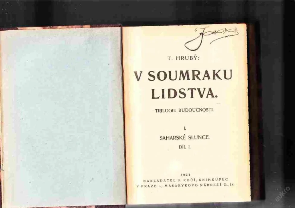 První kniha rozsáhlé románové trilogie V soumraku lidstva (B. Kočí, 1924–1928) představuje rozsáhlý obraz světa budoucnosti, zasazeného do konce třetího tisíciletí. Vládu si rozdělily tři silné korporace – Uhelný svaz, Dopravní unie a Potravinářské sdružení. Svět je rozdělen do několika velkých celků: Slovanských spojených států, Anglosaské republiky, Románské unie, Spojených států amerických a Republiky čínsko-japonské. První díl se zaměřuje na komplikace a spiknutí, které vyvolává energetická krize a boj o moc mezi uhelným průmyslem, solární a atomovou energií. Druhý díl líčí válku mezi žlutou a bílou rasou, v níž Japonci a Číňané obsadí Evropu a Evropané se postaví na odpor, který vyústí v použití atomové bomby. Třetí díl se odehrává o tisíc let později a sleduje konflikt mezi obhájci sociální spravedlnosti a podnikateli. Lidstvo navíc čelí nové době ledové, hrozbě srážky s planetkou a navázání kontaktu s obyvateli Marsu.